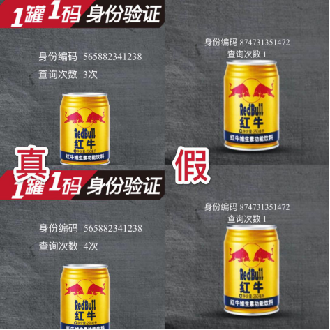 经商标权利人红牛维他命饮料(江苏)有限公司鉴定,上述两批次产品均为假冒红牛,商标权利人解释说“首先是罐盖上的英文字母,正品字体清晰、工整,无残缺字体,钢印部分有明显的凹凸感,拉环圆点有防伪滴胶,仿品英文有略微的模糊感,钢印部分无明显的凹凸感,拉环圆点无防伪滴胶,此外,正品罐身上的二维码扫描页面会随着扫描次数的增加而叠加,这都是由我公司后台数据系统支持的,但仿品的二维码扫描后查询次数永远显示为1次,但是,这批仿品的仿真度较高,不仔细比对,消费者很难辨别产品的真伪。”此外,经浙江方圆检测集团股份有限公司检验,假红牛瓶身上标注的功效成分如牛磺酸、肌醇、咖啡因、烟酰胺、维生素B6等均未检出。