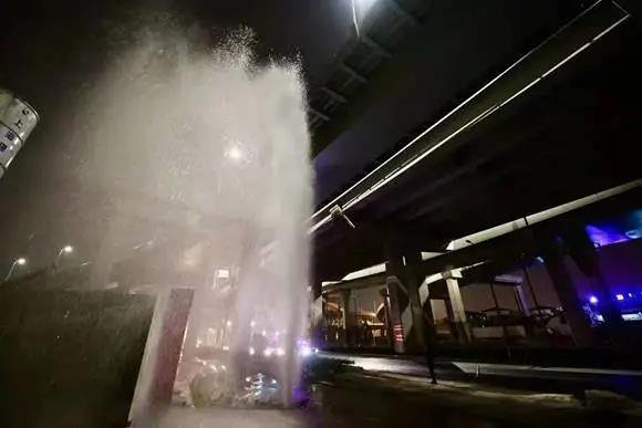 浦东龙东大道附近,一消防栓被撞裂,喷出10米高的水柱。